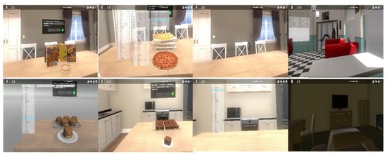 In the assessment phase, participants were first asked to rank their experience of cravings on a visual analog scale (VAS) from 0 to 100 [] for 30 different common binge foods and 4 environments (e.g., kitchen, dining room, bedroom, and restaurant/diner; total of 34 scenes). Please refer to Figure 2 for examples; to review all of the virtual foods and environments, refer to the Supplementary Material, Video S1). The VAS was presented to participants within the virtual environment so there was no disruption to their immersive experience, and the participants used the Oculus controllers to provide their ratings. This information was used to create a list of the 40 food–environment combinations with the highest cravings, which participants then rated with an anxiety score (i.e., anxiety of losing control over eating) on a VAS from 0 to 100. From this assessment, the VR computer software program created an individualized 13-step exposure hierarchy of the participant’s most anxiety provoking foods/environments to be used in the subsequent intervention sessions.