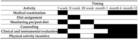 A week after the medical checkup, with a specific software (Nutrigeo8, Progeo, Ascoli Piceno, Italy) an individualized qualitative/quantitative diet was designed for each subject which established the Kcal/days. The software performed calculations related to food chemistry (qualitative and quantitative characterization), basal metabolism, energy requirements, and food portions. The software draws on an official database containing over 2200 foods and recipes. For 14 days (7 days before diet delivery and 7 days from the start of the diet) all subjects were asked to send via mobile phone/email a photographic diary of all the foods consumed during the day; the first 7 days before the start of the diet were to study the eating habits and the 7 days after the start of the diet were to assess adherence to the prescribed diet.
