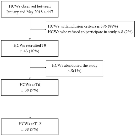The sample of HCWs was recruited from January to May 2019, during the periodical health surveillance, pursuant to Legislative Decree 81/08. Figure 1 shows the Gantt chart of procedures from T0 to T12. Encouragement to perform physical activity was achieved through an easy agreement with the university sport facility; sport education; the suggestion to use smartphone sport-guiding apps, which were greatly appreciated in the early phases of the lockdown; and availability of physicians for telephone consultations.