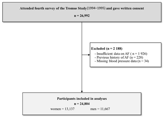 The Tromsø Study is a longitudinal cohort study of the general population in the municipality of Tromsø, Northern Norway [19,20]. In brief, the study was initiated in 1974 to identify cardiovascular risk factors that could be modified through population strategies for the primary prevention of cardiovascular disease. Seven consecutive surveys have been conducted between 1974 and 2016, to which total birth cohorts and random population samples were invited. The present analysis included participants from the fourth survey (Tromsø 4) conducted in 1994–1995. A total of 27,158 persons aged 25–97 years attended (77% of those invited). Of these, 26,992 participants provided informed consent and were eligible for inclusion in the present analyses. Individuals with missing blood pressure data, insufficient information for AF validation, or a history of AF were excluded (Figure 1), leaving a final study population of 24,804 participants (13,137 women and 11,667 men).