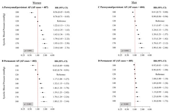 In men, SBP was linearly associated with the risk of paroxysmal/persistent AF (Figure 2C). Compared to men with an SBP of 120 mmHg, men with an SBP of 150 mmHg had a 38% increased risk of incident paroxysmal/persistent AF (HR 1.38, 95% CI 1.21–1.57), while men with an SBP of 180 mmHg had almost twice the risk of incident paroxysmal/persistent AF (HR 1.90, 95% CI 1.46–2.46). We did not observe a significant association between SBP and the risk of permanent AF in men (Figure 2D). There was a significant interaction between SBP and sex (p < 0.001) for permanent AF, but not for paroxysmal/persistent AF (p = 0.156).