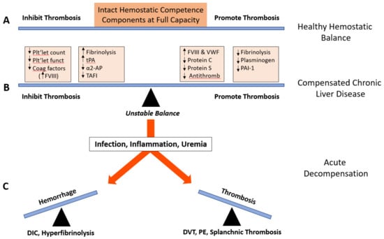 By contrast, special caution and careful decision making are required. As discussed above (see Section 8 “Low Level” Hemostasis and Figure 1), patients with stable liver cirrhosis display a labile low-level equilibrium of pro- and anti-hemostatic components that is highly susceptible to pathogenic triggers such as inappropriate hemotherapy [8,16]. Specifically, decompensated liver disease can lead to increased consumption of coagulation factors, including progressive hypofibrinogenemia and progressive thrombocytopenia, often associated with hyperfibrinolysis [16,28]. Elevated levels of platelet, coagulation and fibrinolysis activation markers may be indicative of their defective clearance [29], mainly due to the reduced hepatocyte mass and a compromised monocyte-macrophage system, and/or reflect, in part, ongoing low-grade disseminated intravascular coagulation (DIC) [16,97]. Such a condition is prone to be boosted by inappropriate replacement therapy and eventually resulting in manifest DIC [11,97].