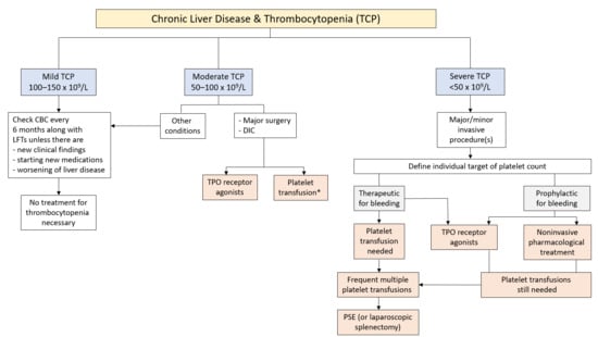 Proposed management of mild, moderate, and severe thrombocytopenia in patients with chronic liver disease. Displayed is the compilation of a treatment algorithm, originally designed by Gangireddy et al. [85] and subsequently adapted by Saab and Brown [25]. In this modification, administration of plasma products (e.g., fibrinogen concentrate, activated factor VII, prothrombin complex concentrate) as rescue therapy for active bleeding is omitted for clarity. To confirm no need for treatment, patients with mild thrombocytopenia should have periodic re-examination including complete blood screening. Of note, for moderate and severe thrombocytopenia, the use of TPO receptor agonists is now considered as first-choice treatment option, whereas platelet transfusions are restricted to major surgery and control of active hemorrhage. The star indicates that, upon platelet transfusion, a target platelet count >100,000/μL is aimed at. Abbreviations: CBC, complete blood cell count; DIC, disseminated intravascular coagulation; LFT, liver function testing; PSE, partial splenic embolization; TCP, thrombocytopenia; TPO, thrombopoietin.