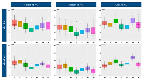 For each tooth position, the height of the KG was greater in the maxilla than in the mandible. The greatest and the least differences were observed in the second molar (4.56 mm (3.98, 5.23) in the maxilla vs. 2.90 mm (2.51, 3.10) in the mandible; data are presented as median value with 95% confidence interval) and in the second premolar (3.95 mm (3.62, 4.18) vs. 3.28 mm (3.15, 3.52)), respectively (Table 1, Figure 2).