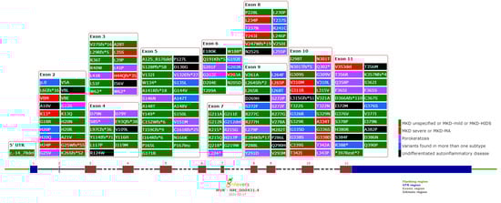 A second related question concerns the biological and/or environmental determinants that cause one phenotypic subtype versus another. There is no doubt that genes other than the causative MVK affect disease manifestation. Recently, Carapito et al., with multi-OMICS analyses, identified a variant of STAT1 that was differentially expressed in two sisters homozygous for the p.(Val377Ile) genotype who had radically opposite (asymptomatic vs. strongly symptomatic) phenotypes, thus providing an initial clue to the low penetrance associated with this variant [47]. This finding most likely explains why p.(Val377Ile) homozygosity is not the most common genotype in MKAD patients with overt disease (Table S2). A constellation of functional polymorphisms is also probably involved in the phenotype. For example, a common genetic background has been postulated between MKD and early onset IBD [23] or Behçet’s disease [44]. The current review highlighted several patients who co-inherited variants in other genes (Table S2), but experimental approaches are needed to ascertain their possible role in MKAD. Finally, epigenetics and environmental factors are likely to play a role in MKAD. For example, DSAP lesions resulting from second-hit somatic mitotic recombination or point mutations with a UV signature were recently detected [29,48].