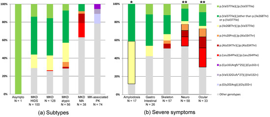 Distribution of the most frequent genotypes in mevalonate kinase-associated diseases patients. (a) According to mevalonate kinase-associated diseases subtypes. The mevalonate kinase-associated diseases (MKAD) subtypes are as reported: MKD: mevalonate kinase deficiency, systemic undefined; HIDS: hyper-IgD (Immunoglobin D) syndrome; MA: mevalonic aciduria; PK: porokeratosis. (b) According to the presence of severe symptoms defined as follows: gastrointestinal: adhesion, ascitis, bleeding, cholestasis, inflammatory bowel disease, and occlusion; skeleton: arthritis, bone sign, and dystonia; neurological: allodynia, ataxia, cerebral atrophy, language disorder, mental or motor retardation, paralysis, seizures, stroke, tremor, and meningitis; ocular: cataract, episcleritis, keratopathy, loss of vision, optic atrophy or neuritis, retinopathy, and uveitis. The boxed genotypes (alone for amyloidosis, or pooled for neurological and ocular symptoms) depict those significantly associated with severe manifestations within a given group of symptoms: * p < 0.001; ** p < 0.0001.