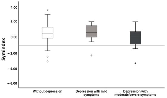From all evaluated HRV parameters, exclusively the frequency domain measurement, the Symindex, gained significant results. In univariate binary regression analysis, ACHD comorbid with MDD showed a significantly lower Symindex (p = 0.048) (Table 1). The analysis with respect to the symptom severity of MDD calculated a particularly reduced HRV in MDD with moderate/severe symptoms (Figure 1).