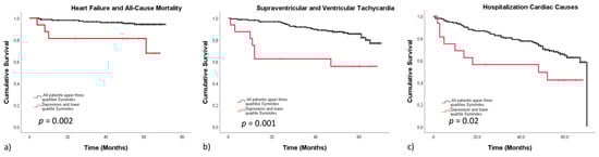 Survival stratified according to the lower quartile of the Symindex comorbid with MDD versus all other patients. The Kaplan–Meier curves display event free survival stratified according to the lower quartile of the Symindex comorbid with depression versus all other patients. Reduced heart rate variability associated with depression presented with a significantly lower event-free survival in all end-points, including heart failure and all-cause mortality (a), arrhythmias (b) and hospitalization due to cardiac causes (c).