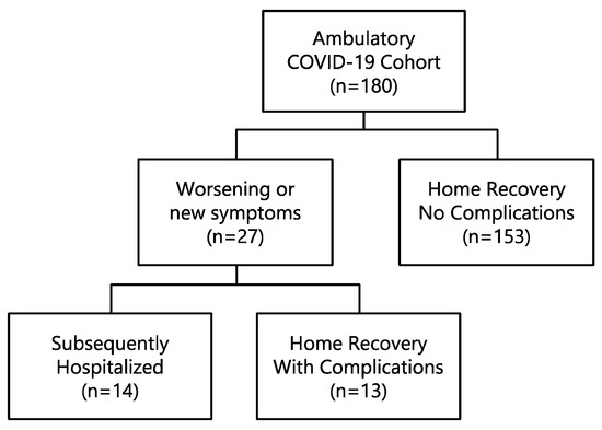 Between 10 March and 31 May 2020, 180 adult patients with COVID-19 were seen in the ambulatory setting at our medical center presenting a median of 5 days after symptom onset (range 1–60 days). Patients were then grouped based on whether they completed home recovery without complications (Home Recovery No Complications; n = 153), completed home recovery with complications (Home Recovery With Complications; n = 13), or developed complications requiring hospitalization (Subsequently Hospitalized; n = 14) (Figure 1). In the Home Recovery With Complications group, ten patients had pneumonia of varying severity, two were diagnosed with bronchitis, and one experienced atrial fibrillation requiring cardioversion. Further evaluation of one of these patients led to diagnosis of adenocarcinoma of the lung with subsequent surgical resection. Patients in the Subsequently Hospitalized group presented a median of five days (range 1–22 days) after initial presentation and included 13 patients with progressive respiratory failure with two patients succumbing to the illness, and one patient hospitalized for severe periorbital cellulitis.