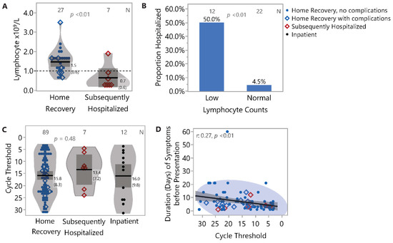 Association of lymphocyte counts and virus cycle threshold with clinical outcome. (A) Lymphocyte counts were lower in the Subsequently Hospitalized group compared to the Home Recovery group. Further, within the Home Recovery group, 50% (3/6) of those with lymphopenia had complications compared to 19% (4/21) among those with normal counts. (B) Low lymphocyte counts (<1.0 × 109 cells/L) were associated with increased risk for subsequent hospitalization. Fifty percent (6/12) of participants with low lymphocyte counts were subsequently hospitalized compared to only 4.5% (1/22) of participants with normal counts. (C) Cycle threshold data, a surrogate for viral load, was not significantly associated with outcomes. Lower cycle threshold values indicate higher levels of viral nucleic acid. (D) Duration of illness at presentation was inversely associated with the level of virus.