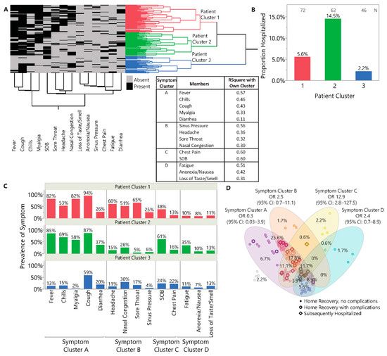 Using two-way hierarchal clustering of symptoms, we observed three patient clusters/phenotypes (Figure 3A). Patient Cluster 2 was most associated with hospitalization (14.5%, 9/62), while Patient Cluster 3 had the lowest hospitalization rate (2.2%, 1/46) (Figure 3B). Symptom clustering determined which symptoms grouped together/co-occurred, resulting in four symptom clusters: A, flu-like with fevers, chills, cough, myalgias, and diarrhea; B, upper respiratory, with nasal congestion, sinus pressure, sore throat, and headache; C, pneumonia-like, with SOB and chest pain; and D, anorexia/nausea, fatigue, and loss of smell/taste. Patient Cluster 1 had high prevalence of flu-like and upper respiratory symptoms, Patient Cluster 2 had high prevalence of flu-like and pneumonia-like symptoms, including the highest prevalence of SOB among the three patient clusters. Patient Cluster 3 had few symptoms, with the exception of cough (Figure 3C).