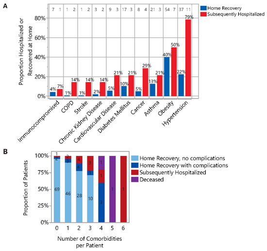 In the Home Recovery No Complications group, 60.1% (92/153) had no known comorbidities, versus 23.1% (3/13) and 14.3% (2/14) in the Home Recovery With Complications group and the Subsequently Hospitalized, respectively (Table 1) (p = 0.0003). Fifty percent of the Subsequently Hospitalized and 40% of the Home Recovery groups were obese (BMI ≥ 30 kg/m2), although obesity alone was not a significant predictor of the binary or ordinal outcome (binary OR 1.5, 95% CI: 0.5–4.5; p = 0.47). Hypertension was another common comorbidity in both the Home Recovery and Subsequently Hospitalized (78.6% and 22.0%, respectively) (Figure 4A). Other comorbidities included asthma (12.7% Home Recovery versus 21.4% Subsequently Hospitalized), cancer (4.8% versus 28.6%), diabetes mellitus (10.2% versus 21.4%), cardiovascular disease (5.4% versus 21.4%), chronic kidney disease (1.8% versus 14.3%), prior stroke (0.6% versus 14.3%), COPD (0.6% versus 14.3%), and immunocompromised state (4.2% versus 7.1%). Of the admitted patients, 46% were current or former smokers compared with 26% of the Home Recovery (p = 0.11).