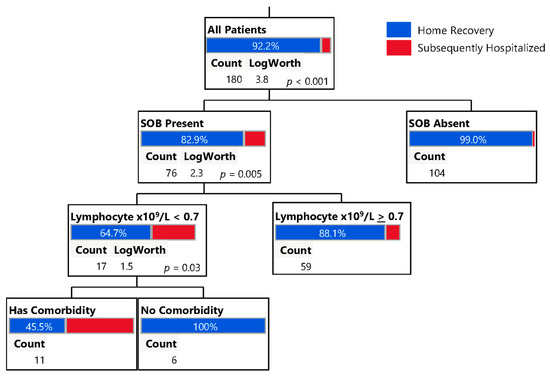 Outcome decision tree analyses. Partitioning of data, where patient outcome is a binary outcome (Home Recovery or Subsequently Hospitalized). Variables included in this analysis were all symptoms, presence of any known comorbidities, lymphocytes, cycle threshold, age, BMI, and sex. Partitioning identifies SOB (p < 0.001), lymphocyte counts (p = 0.005), and comorbidities (p = 0.03) to be most associated with need for hospitalization. Observations with missing data are randomly and iteratively assigned to one of two sides of the split to utilize the entire cohort.