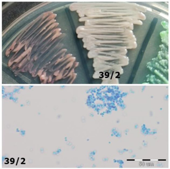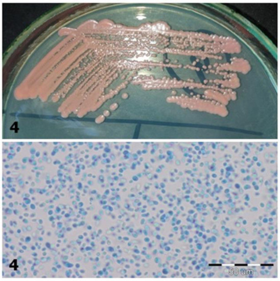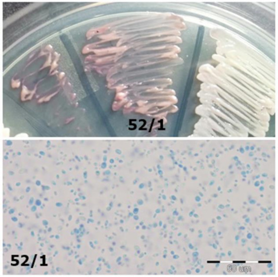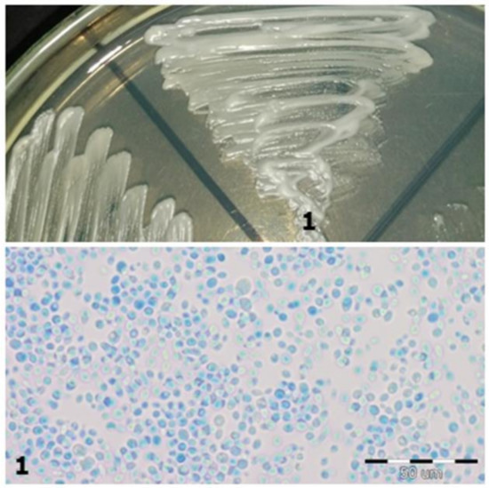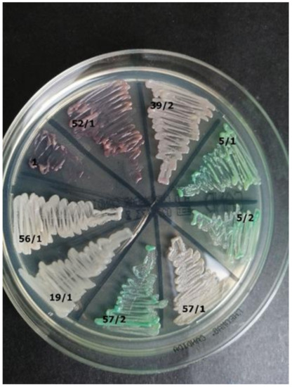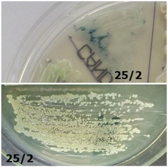The chromogenic medium is designed for the initial identification of C. albicans, C. glabrata, C. krusei, and C. tropicalis species [8]. This medium type makes it possible to distinguish fungi based on their morphology (e.g., edges of the colony, different from the center) and color (e.g., from green through purple to white). The colonies’ color depends on the enzymatic activity of the fungi. During the degradation of chromogenic substrates, the enzymes released will color the compounds. C. albicans and C. dubliniensis, two closely related fungi, produce hexosaminidase, while C. glabrata, C. tropicalis, and C. krusei produce fosfatase [8,9]. Furthermore, colonies cultured on isolating media can be assessed under the microscope using lactophenol blue (Cotton-Blue), with fungi obtaining the same color.