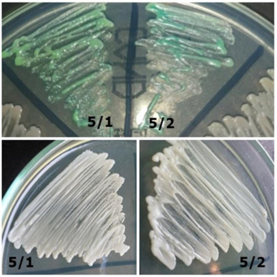 Figure 3. Strains 5/1 and 5/2-morphology on CHROMagar Candida and Sabouraud 2 with chloramphenicol medium (private collection).