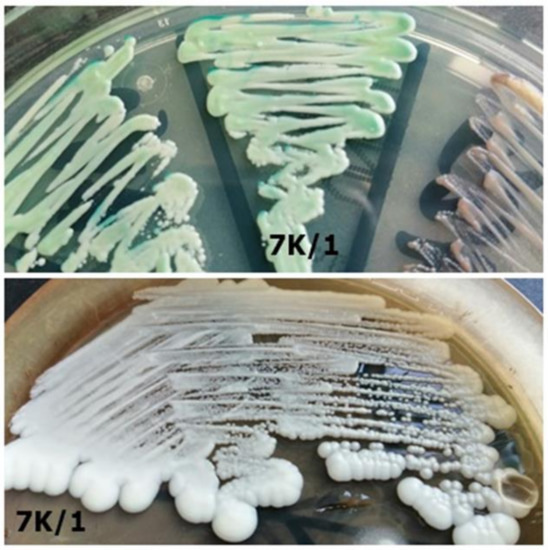 Figure 8. Strain 7K/1-morphology on CHROMagar Candida and Sabouraud 2 with chloramphenicol medium (private collection).