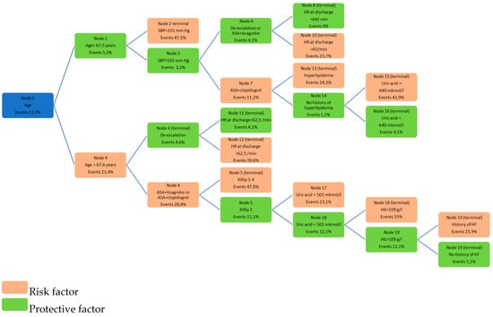 The management of patients with the acute coronary syndrome (ACS) involves long-term dual antiplatelet therapy (APT), including acetylsalicylic acid (ASA) and a P2Y12 inhibitor. In current clinical guidelines on the management of acute coronary syndromes among P2Y12 inhibitors, the priority is given to more modern and more active drugs—ticagrelor and prasugrel [,]. However, in real clinical practice, only some of patients takes these drugs. They are often replaced by clopidogrel (de-escalation of APT) due to therapy’s side effects, the risk of bleeding, and financial reasons. The 2018 European Society of Cardiology guidelines on coronary revascularization include a provision that a de-escalation strategy under platelet aggregation control may be considered after percutaneous coronary interventions (PCI) []. This recommendation is based on the results of the TROPICAL-ACS (Testing Responsiveness to Platelet Inhibition on Chronic Antiplatelet treatment for Acute Coronary Syndromes) trial, where replacement of prasugrel for clopidogrel 2 weeks after hospital discharge was comparable in the risk of adverse events if the more active antiaggregant was continued []. However, the implementation of a new approach also requires assessing the impact on the life expectancy of patients who have undergone ACS in real practice. The new approaches to data processing based on machine learning methods seem promising. One of them is building classification and regression trees, which can be used in the processing of large datasets from studies of real practice.