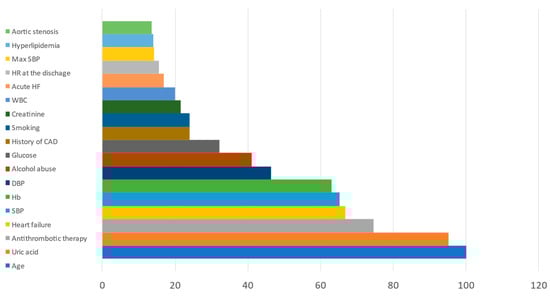 The relative prognostic significance of predictors is presented in Figure 2. Age, the antithrombotic therapy option after hospital discharge, a history of CHF, and uric acid levels were the most significant predictors of all-cause mortality.