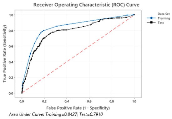 We used ROC (receiver operating characteristic) analysis with an assessment of the AUC (area under ROC curve) indicator to evaluate the quality of the predictive model. The model’s quality was rated as excellent at an AUC value of 0.9–1.0; 0.8–0.9—very good, 0.7–0.8—good, 0.6–0.7—average, and 0.5–0.6—unsatisfactory.