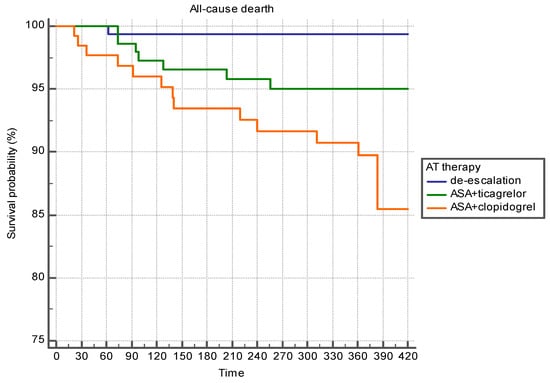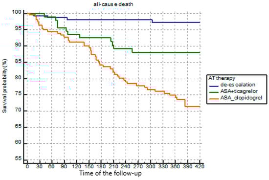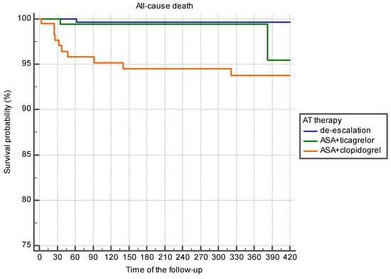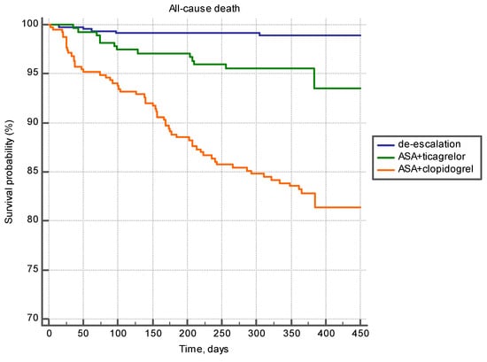 Table 4 shows mean follow-up time and mean survival time; survival probability depending on the APT regimen is shown in Figure 4. Maximum time to the endpoint “all-cause death” was registered in the de-escalation group, and the minimum time was registered in the group of patients treated with the combination of ASA and clopidogrel. Survivors’ follow-up time did not differ in the studied groups (Table 4).