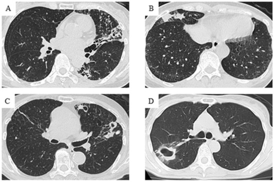 Chest CT findings at the time of MAC-PD diagnosis were evaluated by two independent pulmonologists. The findings of representative patients are shown in Figure 1. Patients with multiple nodules and bronchiectasis were diagnosed with the nodular bronchiectatic (NB) form of MAC-PD. The NB form was further classified into non-cavitary NB (Figure 1A,B) or cavitary NB (Figure 1C) according to the absence or presence of cavitary lesions, respectively. Patients with fibrocavitary lesions mainly in the upper lobes were diagnosed with the fibrocavitary (FC) form of MAC-PD (Figure 1D). Patients with no specific pattern were diagnosed with an unclassified form of MAC-PD.
