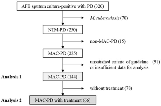 Data from 320 patients with a positive AFB sputum culture and PD were collected. Among the 320 patients, 70 were diagnosed with pulmonary tuberculosis and 250 were diagnosed with NTM-PD. Among the patients with NTM-PD, 235 were diagnosed with MAC-PD; of these, 91 were excluded, because they did not satisfy the criteria of the official ATS/ERS/ESCMID/IDSA clinical practice guidelines or they had insufficient data for analysis. Finally, the data from 144 MAC-PD patients (Analysis 1) and 66 MAC-PD patients who received treatment (Analysis 2) were analyzed in this study. AFB, acid-fast bacillus; PD, pulmonary disease; NTM-PD, nontuberculous mycobacteria pulmonary disease; MAC-PD, Mycobacterium avium complex pulmonary disease.
