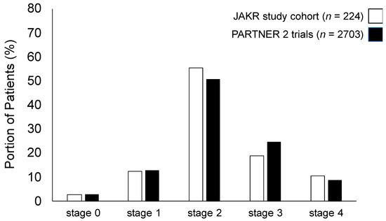 The 224 patients included in our study represent a typical collective of elderly patients undergoing TAVI due to severe degenerative AS in the symptomatic stage exhibiting moderate surgical risk. The mean age was 77.9 ± 7.5 years, 45.1% were male and the mean Society of Thoracic Surgeons (STS)-Score was 4.4% ± 3.1%. The study collective was categorized as described in the material and methods section according to the staging classification of extra-valvular cardiac damage [24] into stages 0 to 4. The distribution of the different stages was as follows: stage 0: 2.7% (6/224 patients), stage 1: 12.5% (28/224 patients), stage 2: 55.4% (124/224 patients), stage 3: 18.8% (42/224 patients), stage 4: 10.7% (24/224 patients). Comparison of these percentages with the results of the staging group distribution in the PARTNER 2 trials, in which the classification was validated and shown to be of prognostic relevance, shows a high level of consistency (Figure 1). Referring to the relatively small number of subjects in some staging groups, especially in stages 0 and 4, we decided to further dichotomize patients into staging group A and B as described above, with group A summarizing AS patients with left heart damage (n = 158) and group B such with additional pulmonary hypertension/right heart damage (n = 66). The baseline characteristics of both the entire patient’ collective and these staging groups are given in Table 1.