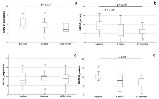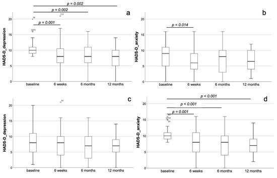 In staging group A, the totality of patients did not reveal relevant dynamics regarding the parameters of HADS-D at the different follow-up time-points (p = n.s.). In the depressive subgroup of staging group A, there was a significant and persisting decrease of depression at the 6-week (8.0 ± 4.5, p = 0.001), the 6-month (7.6 ± 3.5, p < 0.001) as well as the 12-month (7.7 ± 3.3, p < 0.001) follow-up, each compared to baseline (10.1 ± 2.4). In contrast, in these patients, no dynamics with respect to anxiety could be observed (p = n.s. for all follow-up time points) (Figure 3a,b). In the anxious subgroup of staging group A, we could also detect a significant and stable decrease of anxiety at the 6-week (7.9 ± 3.8, p = 0.002), the 6-month (7.4 ± 4.1, p = 0.001) and at the 12-month (7.2 ± 3.5, p = 0.003) follow-up, each compared with baseline (10.3 ± 1.9). Again, when considering depression in these patients, there was a significant decrease only when comparing the 6-month follow-up (5.9 ± 3.8) with baseline (8.1 ± 4.1, p = 0.036) (Figure 3c,d). Similar to the entire patients’ collective of the study (n = 224), also in staging group A (n = 158), a significant and stable improvement in EQ-VAS and SMWT as well as significantly lower BNP serum levels after TAVI could be proven (p < 0.05 for all follow-up time-points compared to baseline).