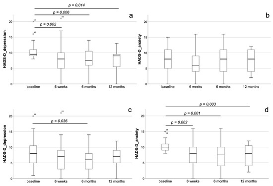 In the depressive subgroup, there was a significant improvement already 6 weeks after TAVI for both depression (8.3 ± 4.3 at the 6-week follow-up vs. 10.3 ± 2.5 at baseline, p = 0.001) and anxiety (6.3 ± 3.9 at the 6-week follow-up vs. 8.1 ± 3.9 at baseline, p = 0.014). For depression but not for anxiety, this improvement remained stable even until the 6-month (7.9 ± 3.8, p = 0.002 when compared with baseline) as well as the 12-month (7.7 ± 3.4, p = 0.002 when compared with baseline) follow-up (Figure 2a,b). Concomitantly, we observed significant improvements after 6 weeks for BNP (p < 0.001) and SMWT (p = 0.003). These changes were stable even until the 12-month follow-up for BNP (p < 0.001 compared to baseline) and SMWT (p = 0.023 compared to baseline). Additionally, there was an amelioration of EQ-5D-5L_anxiety/depression (p = 0.026) and EQ-VAS (p = 0.037) 6 months after TAVI, which was stable for EQ-5D-5L_anxiety/depression after 12 months (p = 0.024, each compared to baseline).