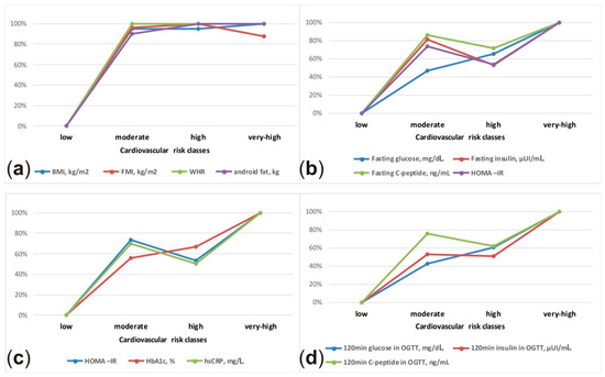 Schematic presentation of the relative differences in anthropometric (a), body composition (a) and laboratory parameters (b–d) between cardiovascular risk classes. The lowest value was assumed as 0% and the highest value as 100%.