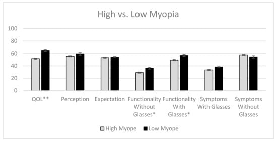 The quality of life (QOL) scores of presbyopes with low myopia versus high myopia, with error bars representing standard error. * Statistically significant, with a p-value of <0.05; ** statistically significant, with a p-value of <0.001.