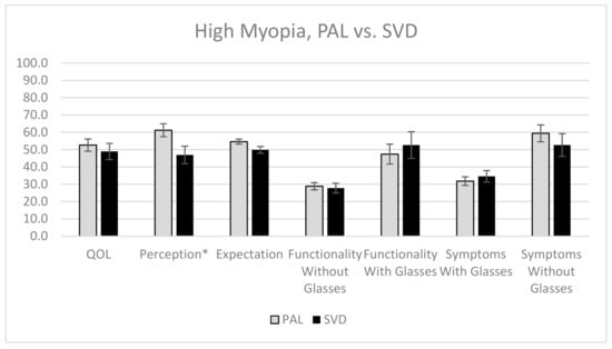 The QOL scores of highly myopic presbyopes who wore PAL and SVD lenses for all five subscales, with error bars representing standard error. * Statistically significant, with p-value of <0.05.