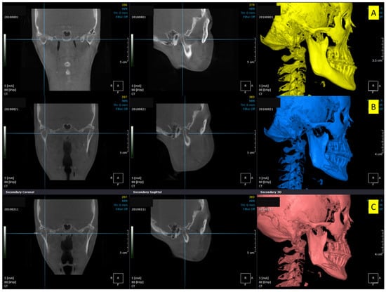 CBCT scans were obtained at several time points: pre-surgical (T0), post-surgical two weeks (T1), and 4 to 5 months after screw removal (T2). CBCT scans were obtained using Asahi Alphard 3030® (Asahi Roentgen Ind., Co. Ltd., Kyoto, Japan) in C-mode with an imaging volume of 200 × 178 mm and a voxel size of 0.39 mm. The scanning parameters were fixed at 80 kVp, 5 mA, and 17 s for all patients. The evaluation of TMJ positional changes was performed before and after the surgery using CBCT, OnDemand 3D software (Cybermed, Seoul, Korea), and Checkpoint software (Stratovan, Davis, CA, USA) (Figure 3). Digital imaging and communications in medicine (DICOM) images were reconstructed using OnDemand3D software, which were oriented along the Frankfort horizontal plane in reference to the right porion, nasion, and left orbitale.