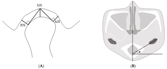 (A) The plane of reference in the axial plane at the left external carotid canal with lines from the innermost and outermost points on the condyle. Reference plane perpendicular to the line at the midpoint. Anterior, superior, and posterior joint spaces in the plane (AJS, SJS, and PJS, respectively). (B) The angle of the condyle was defined as the angle between the line from the innermost point to the outermost point of the condyle parallel to the sagittal plane and the sagittal plane. AJS: anterior joint space; SJS: superior joint space; PJS: posterior joint space.
