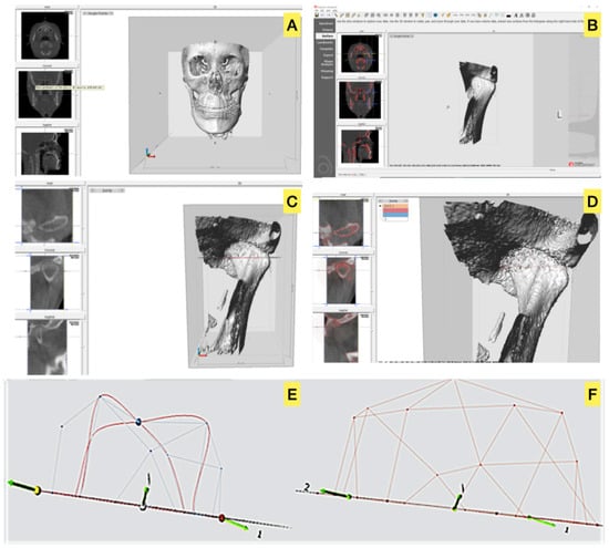 A view on Checkpoint (Stratovan): (A). Imported cone-beam computed tomography data exported in digital imaging and communications in medicine format, (B). Cropped image of the volume of the left condyle–fossa unit, (C). Individual points on the medial and lateral poles of the condylar head, (D). Distance measurement between the medial and lateral poles of the condylar head (diameter), (E). Volume space of the condylar head above the reference plane, (F). Volume space between the reference plane and glenoid fossa. We defined the difference between (E) and (F) as the joint space volume.
