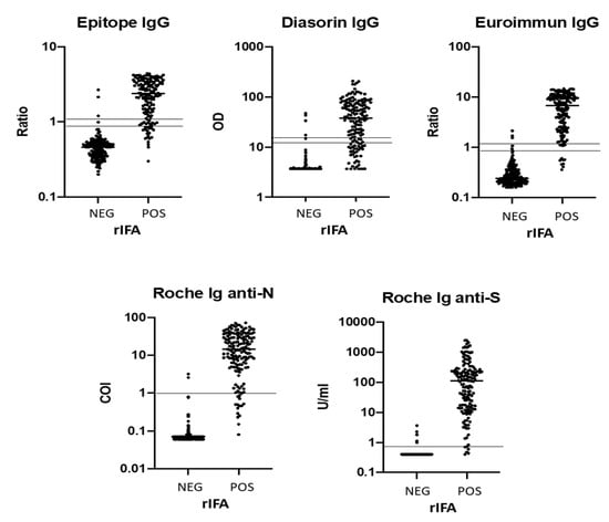 The distribution of positive and negative data points showed better separation for Euroimmun and Roche assays. The largest dynamic range was observed for the quantitative Roche S assay (Figure 1).