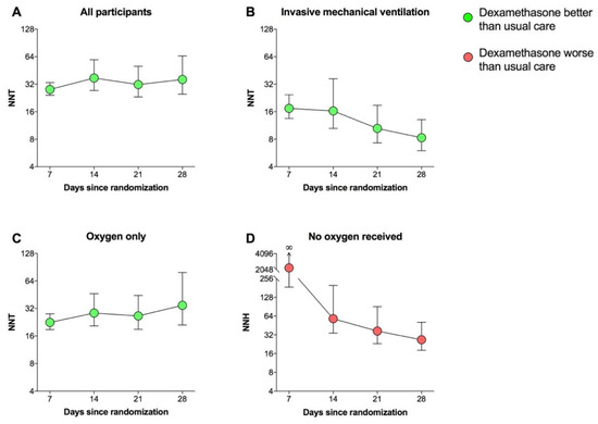 In this study, the values of NNT and NNH are reported as person-based and calculated by analyzing the Kaplan–Meier survival curves or by using raw mortality data for dexamethasone and usual care provided in the primary publication [2], as previously described [8,9]. The NNT and NNH with 95%CI are the reciprocal of the ARR or ARI in mortality, respectively, associated with dexamethasone vs. usual care over 7, 14, 21, and 28 days since randomization.