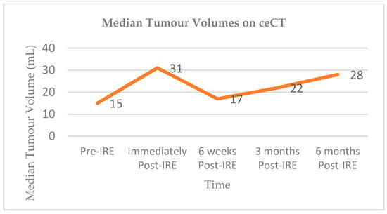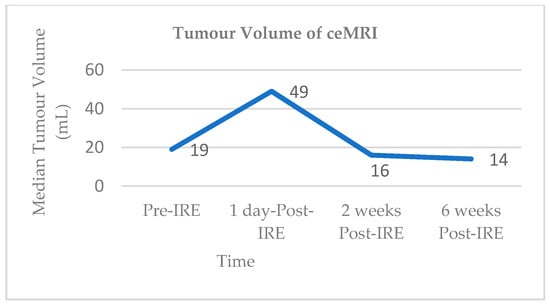 Vroomen and colleagues assessed imaging characteristics in 25 patients with LAPC following CT-guided percutaneous IRE [98]. All patients had biopsy-proven LAPC and underwent contrast enhanced CT (ceCT) prior to IRE. Subsequent contrast enhanced MRI (ceMRI) was performed 1 day, 2 weeks, and 6 weeks following IRE treatment. At the 6-week mark patients additionally underwent a ceCT. A final ceCT was performed 3 months after IRE. Figure 1 and Figure 2 show the median tumour volumes across the imaging modalities and demonstrate an increase in tumour volume in the initial post-IRE period on both ceCT and ceMRI, followed by a decrease. The authors reported that there was a hyperintense border surrounding the IRE ablation zone in the portal venous phase in 71% of patients, noted 1 day and 2 weeks post IRE, and which was identified in only 29% of patients at the 6 week follow up. The observed hyperintense rim surrounding the ablation zone 1 day post-IRE may represent reactive hyperaemia and oedematous inflammation and still include residual disease. A longer follow-up is required in order to evaluate the exact significance of this radiological characteristic.