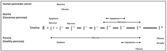 Information on pathological changes following IRE in human pancreatic cancer tissue is limited to clinical studies that have reported on patients with LAPC or borderline resectable disease that have been downstaged post-IRE, and to patients where IRE has been used as a margin accentuation tool [37,107,108]. Figure 3 demonstrates a timeline of histological changes reported in the literature across different models.