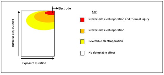 Schematic representation of the basic relationship between electric field strength and length of pulse; key parameters in establishing electroporation. For electroporation to occur, the transmembrane potential difference needs to be between 0.7 and 1 volts [123], once this is achieved, pores form. With increasing voltage and/or increasing length of treatment, these membrane changes become permanent, i.e., IRE resulting in cell death [123].