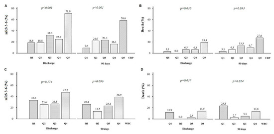 Panel (A,B). The proportion of patients with disability (modified Rankin Scale, mRS 3–6) or death (mRS = 6) on discharge and at day 90 after stroke onset, according to the quintile (quintile 1–quintile 5, Q1–Q5) of C-reactive protein (CRP) values. Panel (C,D). The proportion of patients with disability or death on discharge and at day 90 after stroke onset, according to the quartile (quartile 1–quartile 4, Q1–Q4) of white blood cell count (WBC).