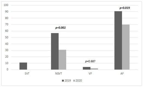 From 9 March to 4 May 2020, we observed a significant reduction in the number of remote monitoring events, when compared to the same period of 2019. In particular, 57 (18.3%) episodes of NSVT arrhythmia were recorded, compared with 31 (9.9%) episodes recorded in 2020 (p = 0.002). In addition, in 2019, patients developed more AF events, compared with 2020 (29.2% vs. 22.4% p = 0.019) (Figure 1).