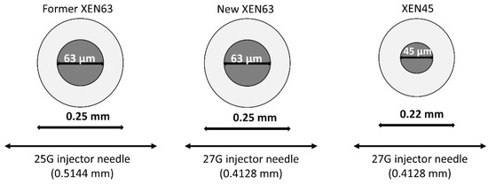 The main difference between XEN45 and XEN63 is the bore of the stent [10,11,18,19,20,21]. The new XEN63 device is introduced by using a 27G needle, similarly to the XEN45 stent. Since the outer diameter of XEN63 is greater than that of XEN45, the side flow with the XEN63 is reduced compared with the XEN45 (Figure 1).