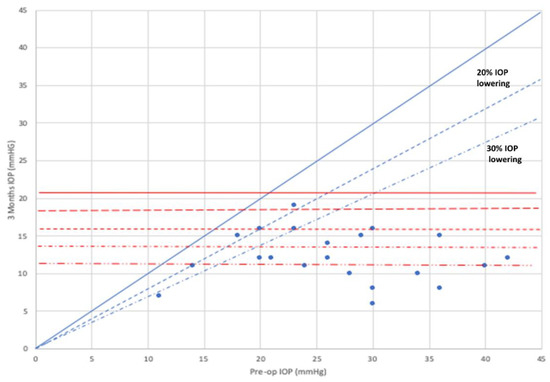 Scatter plot of the intraocular pressure at baseline and month 3. Mean difference −14.8 ± 6.0 mm Hg, 95 Confidence interval −18.4 to −11.2 mm Hg; p < 0.0001 (two-tailed paired-samples Student t test). The 20% and the 30% lines indicate the level beneath which an IOP reduction of more than 20% or 30%, respectively, compared to baseline value before surgery was reached by the individual cases. IOP: Intraocular pressure.