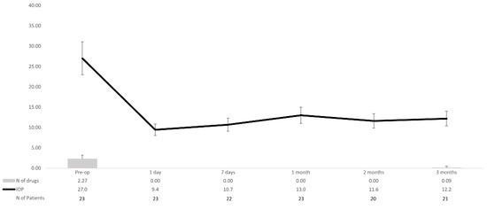Mean number of topical ocular hypotensive medications was significantly reduced from 2.27 ± 0.94 drugs at baseline to 0.09 ± 0.42 drugs at month 3 (p < 0.0001). At month 3, 22 (95.7%) eyes did not receive any antiglaucoma medication.