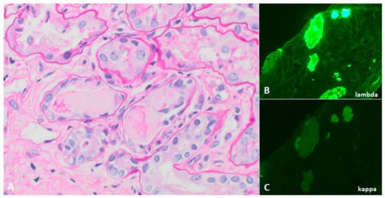 - Gibier, J.-B.; Gnemmi, V.; Glowacki, F.; Boyle, E.M.; Lopez, B.; MacNamara, E.; Hoffmann, M.; Azar, R.; Guincestre, T.; Bourdon, F.; et al. Intratubular amyloid in light chain cast nephropathy is a risk factor for systemic light chain amyloidosis. Mod. Pathol. 2017, 31, 452–462. [Google Scholar] [CrossRef]