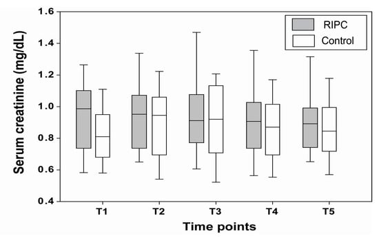 Comparison of time-dependent changes in the serum creatinine between the RIPC and control groups. Time points were defined as preoperative (T1), at post-anesthesia care unit (T2), postoperative day 1 (T3), postoperative day 3 (T4), and two weeks after surgery (T5).