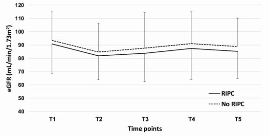 Figure 2 shows time-dependent changes in the serum creatinine, and there was no significant difference between the RIPC and control groups at all five time points. Figure 3 shows the time-dependent changes in the eGFR, and there were no significant differences between the two groups at all the time points.