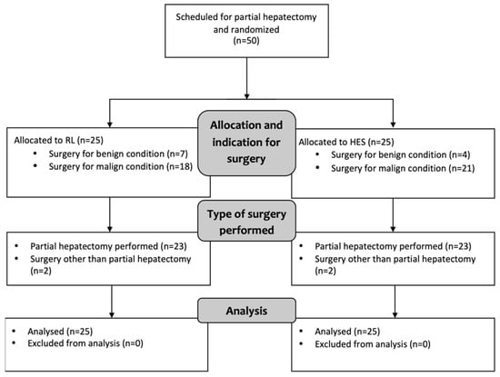 A total of 50 patients were randomly assigned to one of the two study groups. Twenty-five patients received HES, whereas RL was used in the control group of 25 patients. Figure 1 shows a flowchart depicting the inclusion and randomization of patients, as well as the indication for and type of surgery. Two patients in each study group did not undergo partial hepatectomy: one patient in each group underwent extended cholecystectomy, whereas another patient in each group underwent exploratory laparotomy with multiple open liver biopsies. None of the patients in either study group underwent vascular resection and reconstruction.
