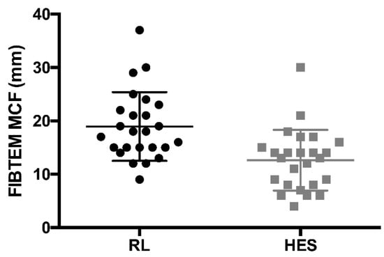 Difference in perioperative minimum of FIBTEM MCF: RL 19 ± 6 mm vs. HES 13 ± 6 mm; p < 0.001 (HES, hydroxyethyl starch; MCF, maximum clot firmness; RL, Ringer’s lactate).